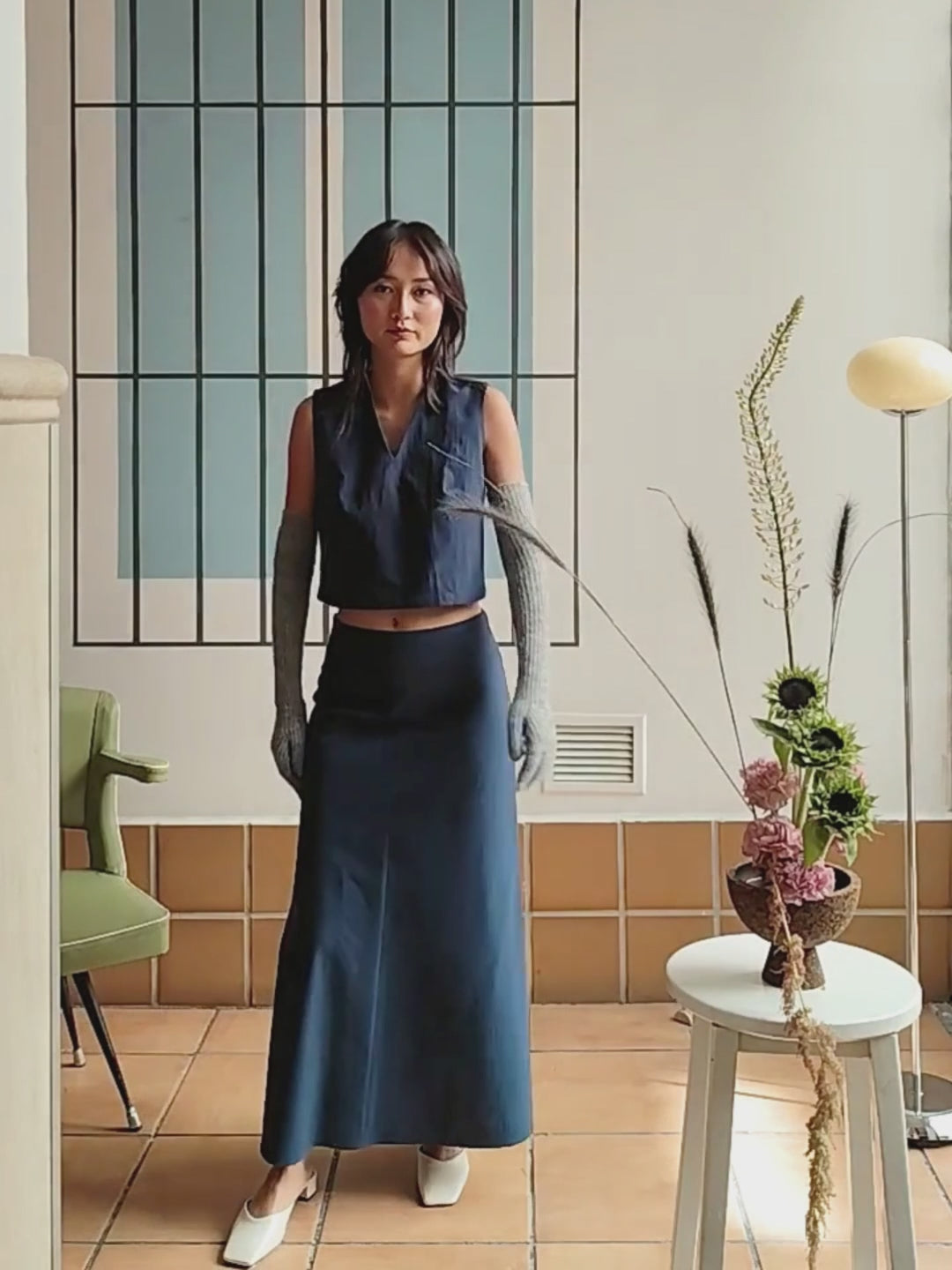 Top silueta recta ligeramente entallada en cintura sin mangas y escote en V. Largo hasta el ombligo. Pinzas de pecho. Doble canesú en espalda. , l