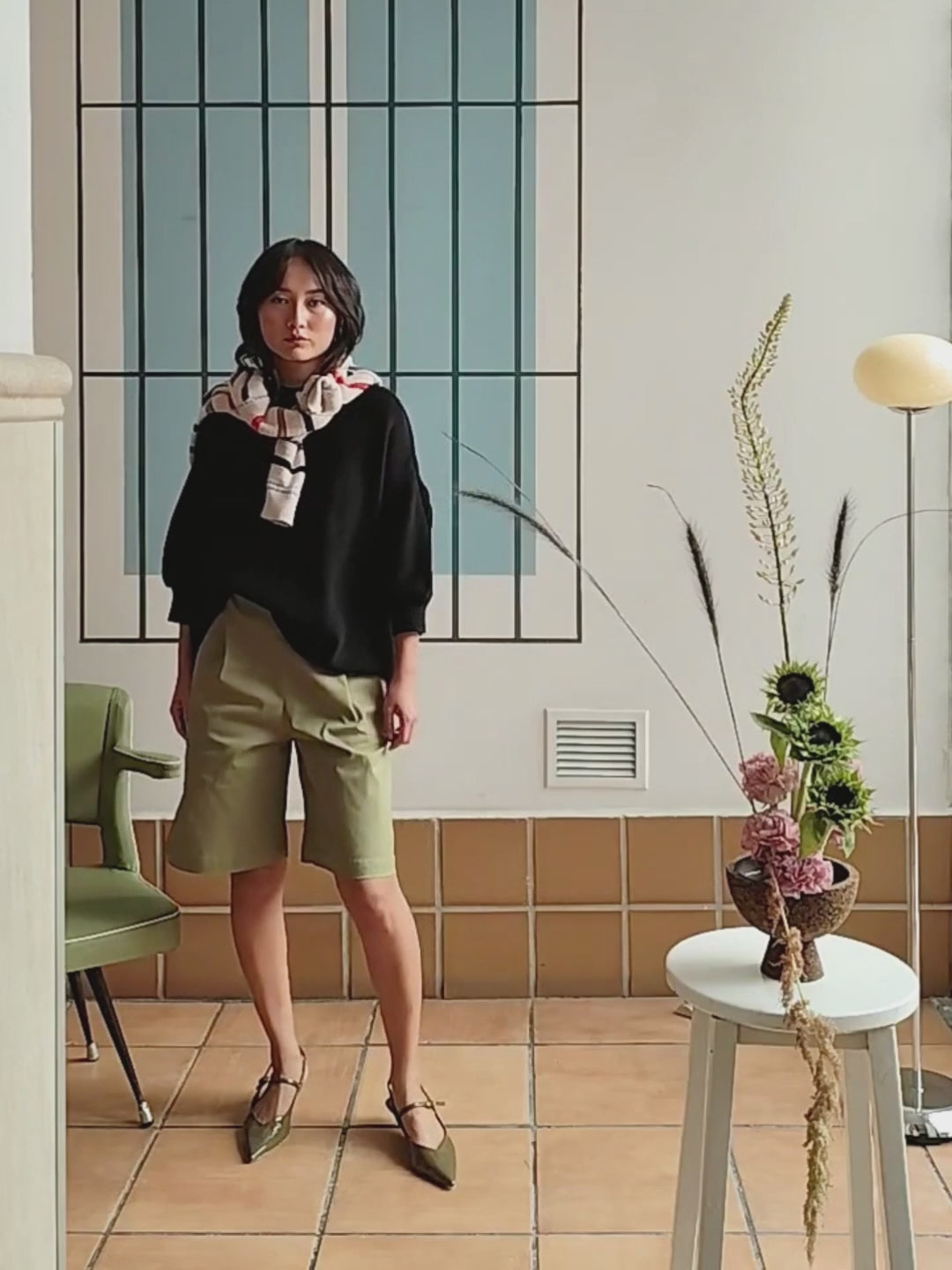 Bermuda amplia y recta de tiro alto. Largura hasta encima de la rodilla. Sin cinturilla, pulido con vista. Pliegue en delantero y pinza en espalda para ajustar en la cintura. Bolsillos laterales insertados en costura. Cierre con cremallera invisible en centro espalda.