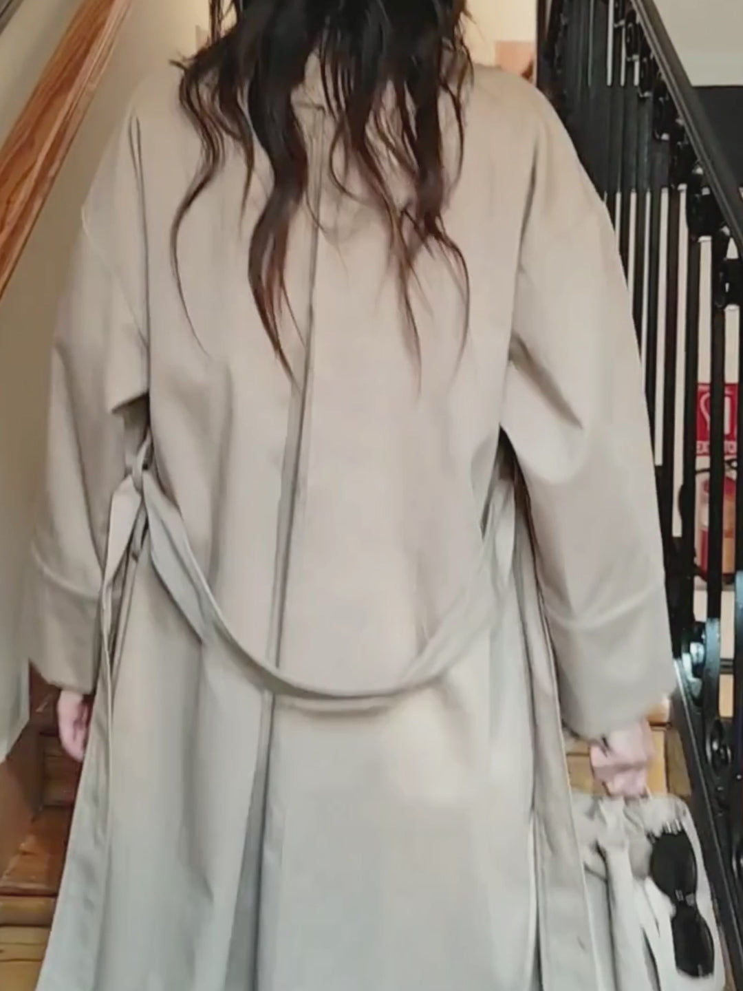 Gabardina Oversize hasta la pantorrilla. Silueta recta con aberturas laterales. Hombro caído. Cuello camisero con pie. Manga recta con puño ancho (11,5cm); cruce y botonadura simple con ojales y botones de 4 agujeros. Bolsillos de plastrón con abertura lateral. Aberturas laterales. Espalda con fuelle cetral desde el pie de cuello y presilla de tela con ojal y botón. Cinturón y doble trabilla lateral de tela.