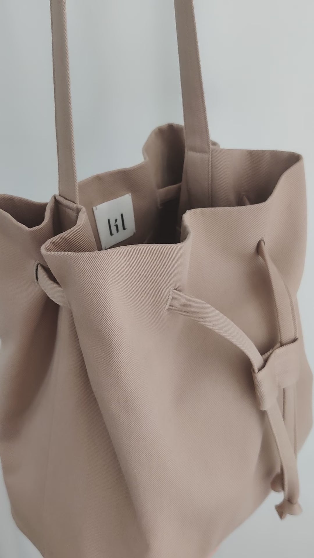 Bolso saco de sarga , con forro, asa y cordón también de sarga. Base rectangular con cantos romos. Ojales confeccionados a máquina para pasar el cordón y fruncir. Pieza para ajustar el cordón del mismo tejido.